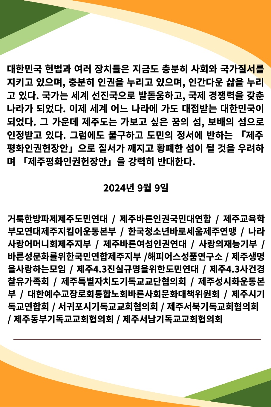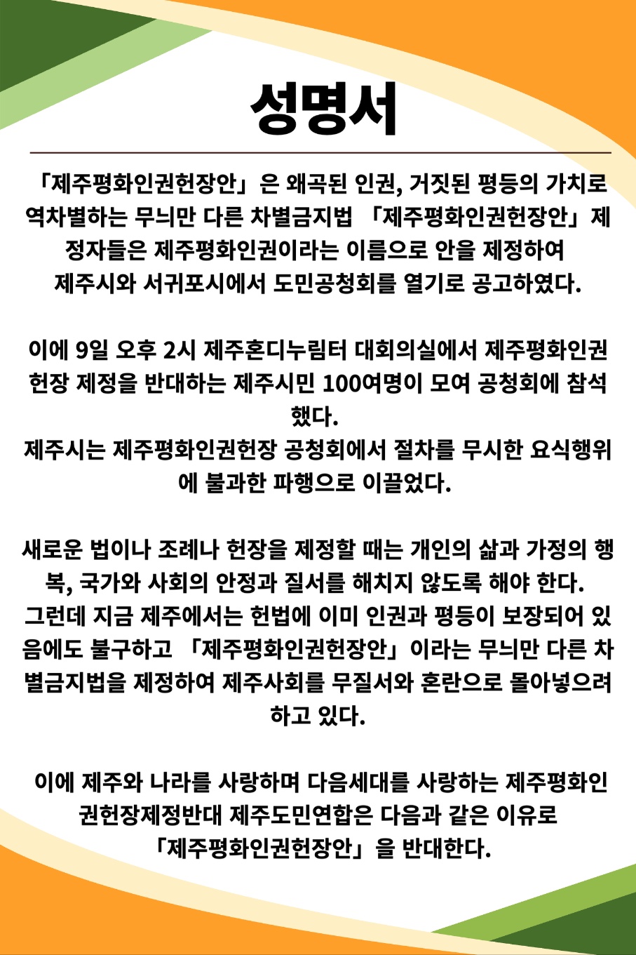 이에 제주와 나라를 사랑하며 다음세대를 사랑하는 제주평화인권헌장제정반대 제주도민연합은 다음과 같은 이유로「제주평화인권헌장안」을 반대한다.