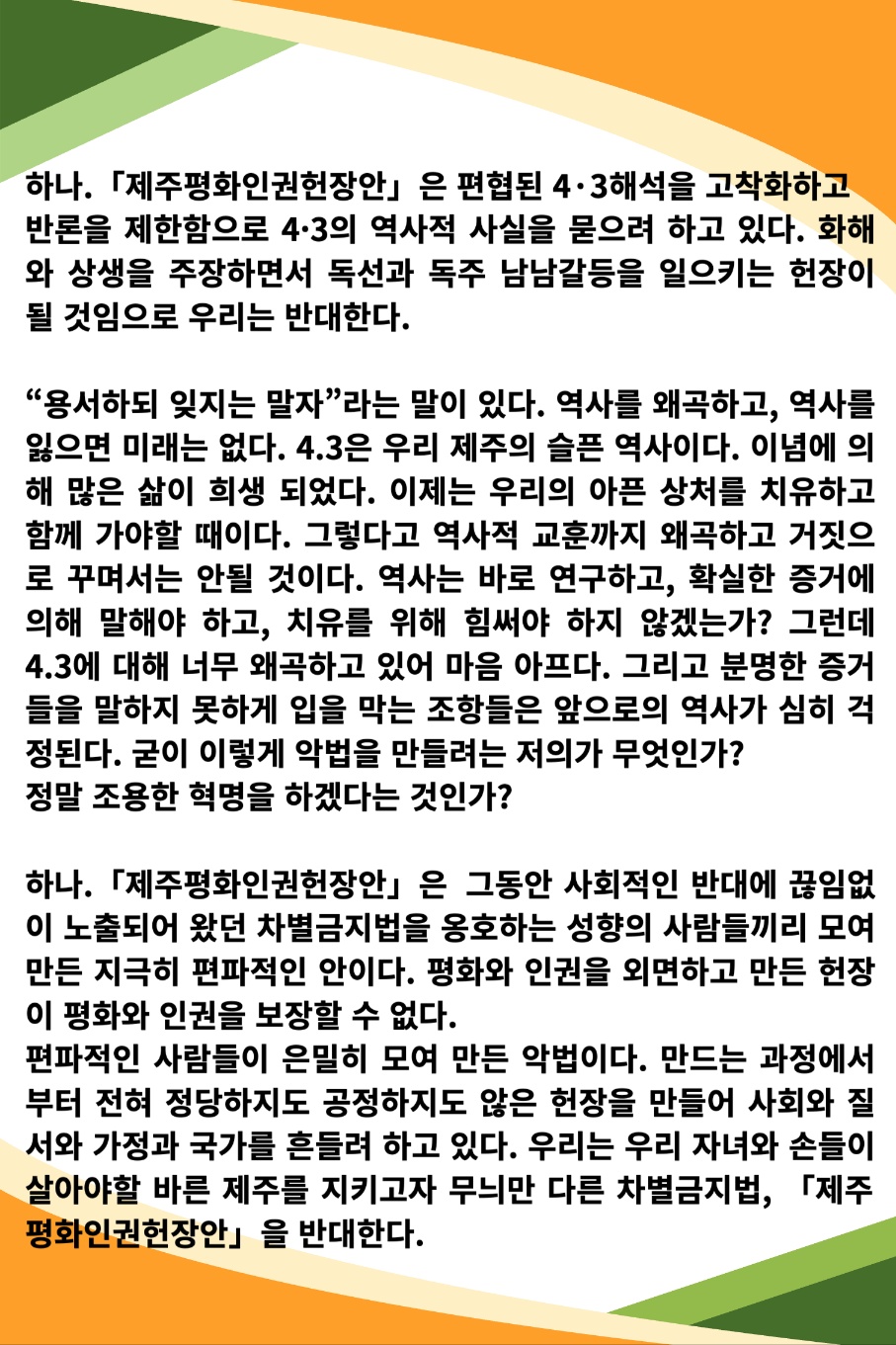 편파적인 사람들이 은밀히 모여 만든 악법이다. 만드는 과정에서부터 전혀 정당하지도 공정하지도 않은 헌장을 만들어 사회와 질서와 가정과 국가를 흔들려 하고 있다. 우리는 우리 자녀와 손들이 살아야할 바른 제주를 지키고자 무늬만 다른 차별금지법, 「제주평화인권헌장안」을 반대한다.