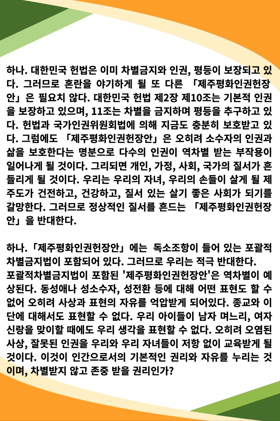 하나. 대한 민국 헌법은 이미 차별금지와 인권, 평등이 보장되고 있다. 그러므로 혼란을 야기하게 될 또 다른 「제주평화인권헌장안」은 필요치 않다 대한민국 헌법 제2장 제10조는 기본적 인권을 보장하고 있으며 11조는 차별을 금지하며 평등을 추구하고 있다. 헌법과 국가인권위원회법에 의해 지금도 충분히 보호받고 있다. 그럼에도 「제주평화인권헌장안」은 오히려 소수자의 인권과 삶을 보호한다는 명분으로 다수의 인권이 역차별 받는 부작용이 일어나게 될 것이다. 그리되면 개인, 가정, 사회, 국가의 질서가 흔들리게 될 것이다. 우리는 우리의 자녀, 우리의 손들이 살게 될 제주도가 건전하고, 건강하고, 질서 있는 살기 좋은 사회가 되기를 갈망한다. 그러므로 정상적인 질서를 흔드는 「제주평화인권헌장안」을 반대한다.